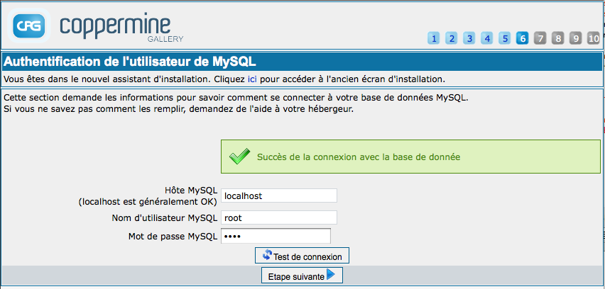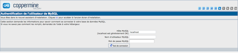 Your MySQL configuration (votre configuration MySQL) MySQL est le type de service de base de données disponible sur la plupart des serveurs web. Si vous ne l'avez pas, vous ne pouvez pas l'installer vous-même. Si vous avez un hébergement web, vous êtes probablement malchanceux. Il est obligatoire d'avoir une base de données MySQL pour utiliser Coppermine ou beaucoup d'autres scripts PHP. Vous ne pouvez pas truquer les informations MySQL pendant l'installation, vous devez les connaître avant, et entrer les informations comme demandé. Si vous n'êtes pas sur des informations requises, demandez votre hébergeur.