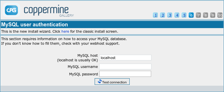 | Your MySQL configuration | MySQL is the type of database service that is available on most webservers. If you don't have it, you cannot install it. That is, unless the server is yours to administer. If you are webhosted, you are probably out of luck. It's mandatory to have a mySQL database to run Coppermine or any other PHP-based script. You can not fake the mySQL information during install, you must know it before hand, and enter the information as required. If you're not sure about the information required, ask your webhost. |